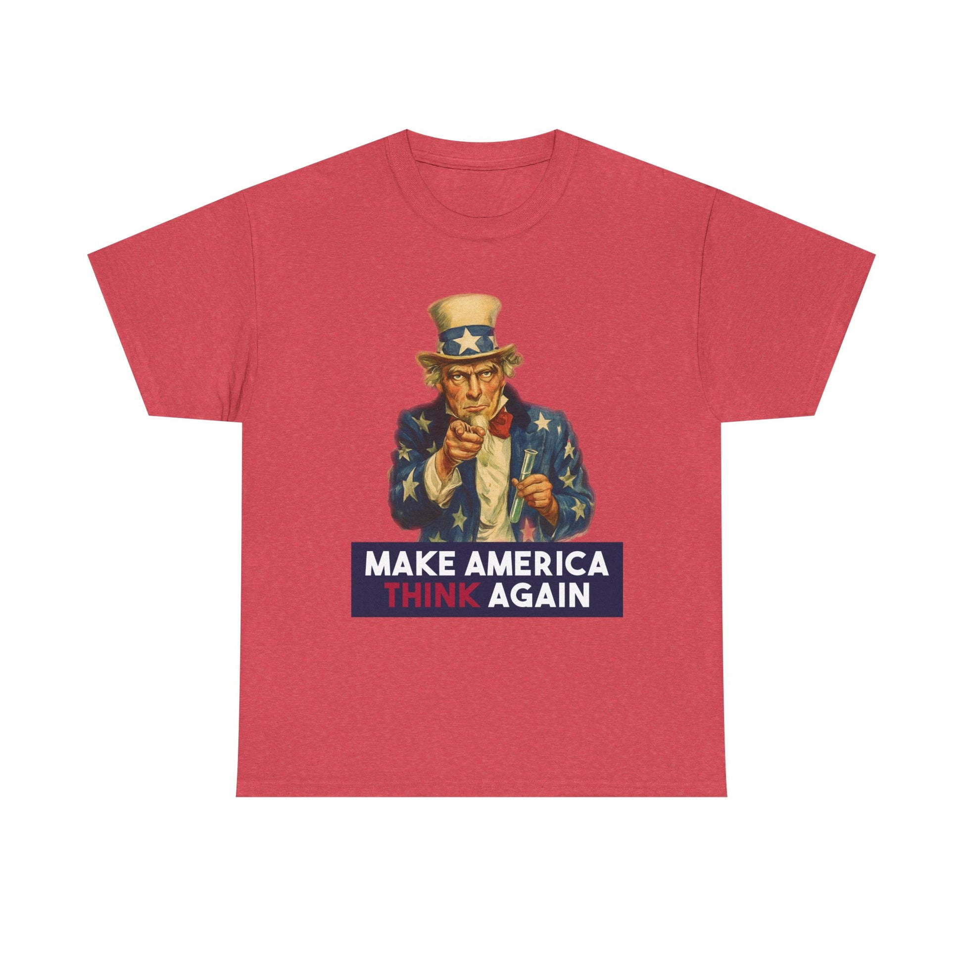 Enough with slogans. It’s time for solutions. Sporting a defiant Uncle Sam holding a test tube, this shirt flips propaganda on its head and advocates a revolutionary concept: thinking. Perfect for science enthusiasts, truth defenders, and anyone who knows America’s future depends on facts, reason, and critical thought.
