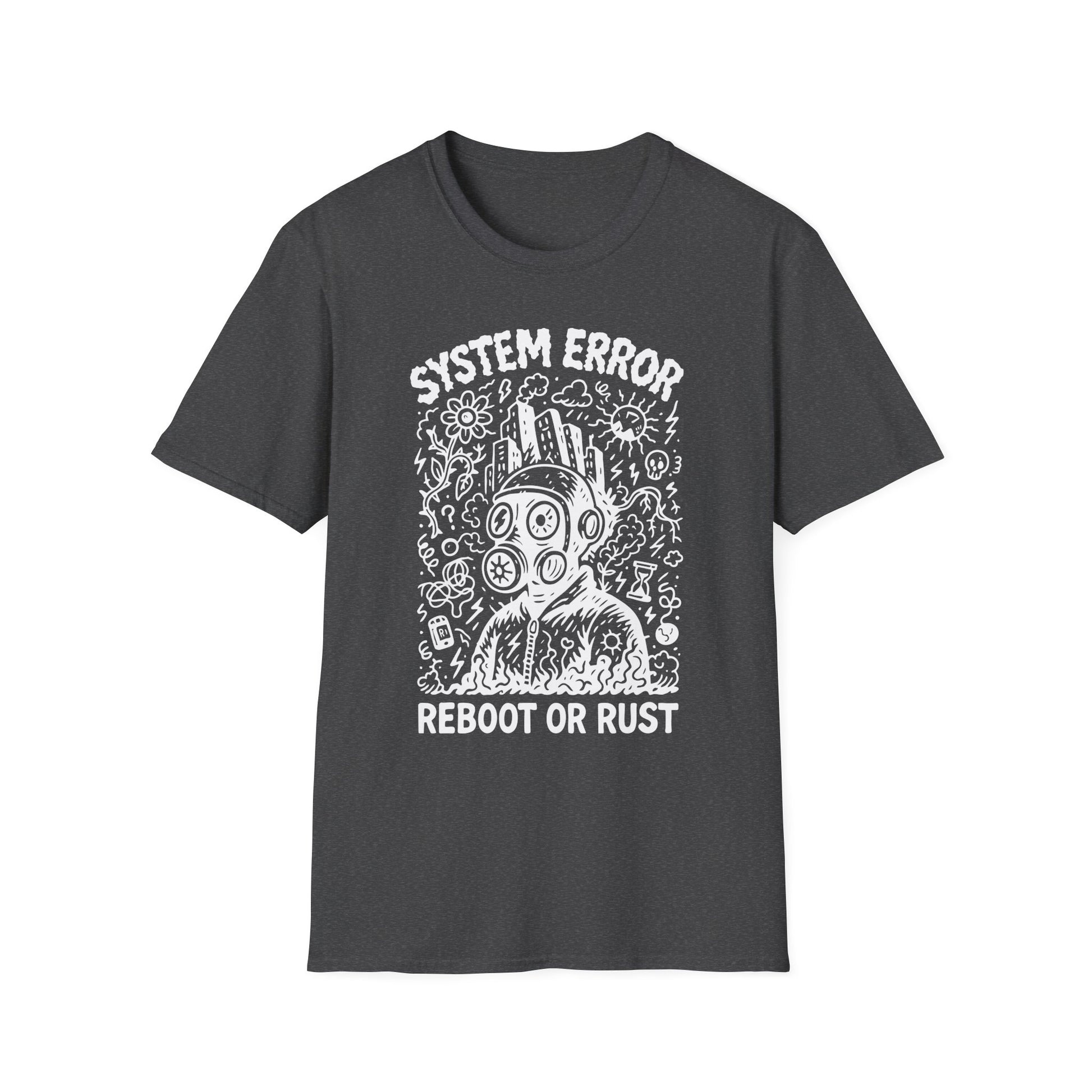 This Reboot or Rust tee takes the playful chaos of modern doodle art and short-circuits it with dystopian grit. Hand-drawn style meets industrial decay in a design packed with mutated flowers, static-soaked symbolism, and one very resigned figure in a gas mask.